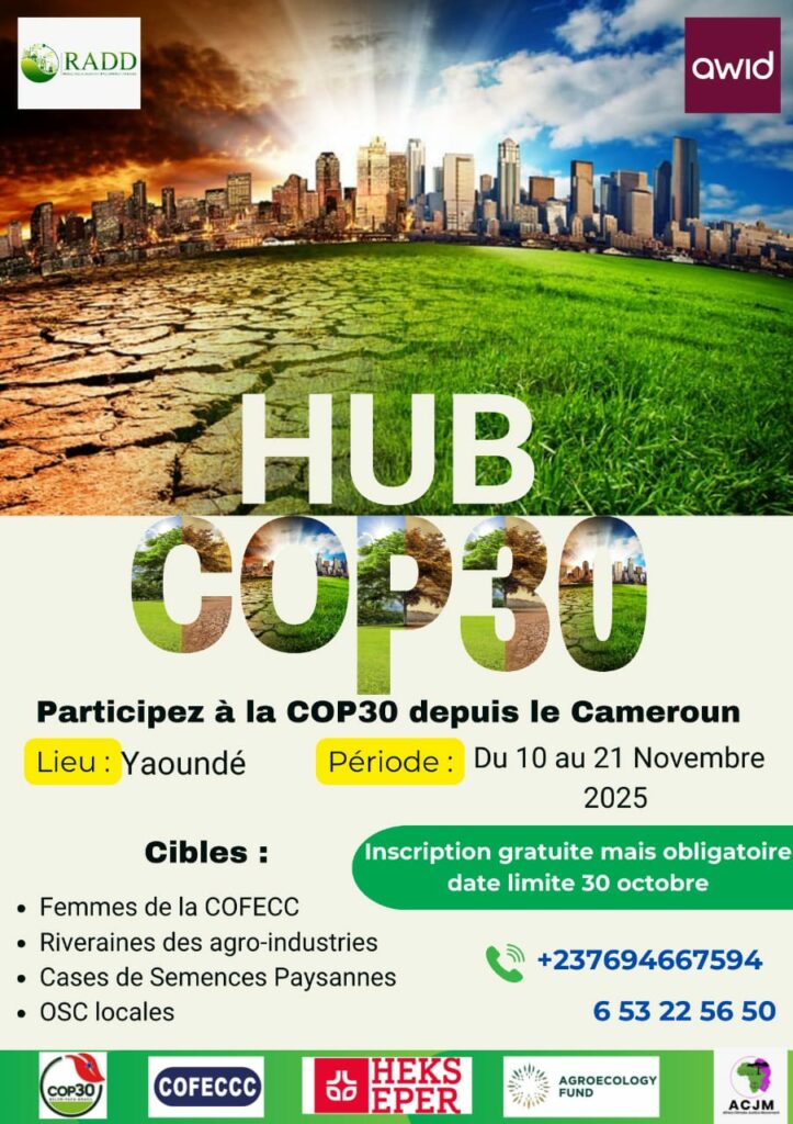 Le Hub Cop30 ou Hup de résistance par l'action. En Novembre 2024, La COFECCC a defini sa feuille de route au travers des notes conceptuelles élaborées à Mbalmayo. Pendant le Hubcop30, un accent sera mis sur la recherche des voies et moyens pour la mise en oeuvre de ce projet de société des femmes camerounaises face à la crise climatique. Des professionnels de la recherche du financement sont deja mobilisés pour nous accompagner. Comment partir d'une idée de projet à son implémentation. Ce sera une articulation centrale qui doit conduire à des pistes réelles, opérationnelles pour trouver des moyens de la réalisation les projets issus de notre recceuil de 50 notes conceptuelles. C'est la réponse des femmes du Cameroun aux changements climatiques, nos solutions que nous devons faire connaître aux decideurs, partenaires techniques et financiers. Proposer ses propres solutions qui sont des solutions feministes est aussi une façon de resister aux solutions qui nous sont imposéses par des corporations, les multinationales soutenues par les pays du Nord pollueurs et à plus de 90% responsables de la crise climatique. Une autre articulation sera de rejoindre nos représentants à Belem, à la Cop30 pour qu'ils nous donnent le compte rendu du déroulement de la COP. Nous comprendrons beaucoup mieux ce qu'est la COP et comment elles nous impactent au quotidien. La troisième articulation nous permettra d'aller dans les années 60 pour comprendre les valeurs originelles de la forêt et de l'eau dans notre vie d'aujourd' hui. Ce sera pendant la journée du 19 novembre que nous appellerons la journée des années 60. L'articulation sur le bien être est particulière. Nous allons devoir profiter de l'espace, forêt, eau, du fait de la preésence de la Sanaga, le sport, le camping, les seigneurs de la forêt, les pygmées qui seront gracieusement à notre disposition pour nous permetre de se refaire des forces, des énergies, se détendre, faire un silence, une véritable reconnection à la terre, à l'eau. Voilà en bref, l'aperçu du bouquet que nous offre le HUBCOP30 à la SANAGA CAMPING BEACH. *RENDEZ-VOUS DU 18 AU 19 NOVEMBRE 2025 A NKOTENG.